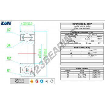El Rodamiento De Bolas, conocido como 62307-ZEN ZEN, tiene un diámetro interior de 35 mm, un diámetro exterior de 80 mm y un espesor de 31 mm.