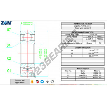 El Rodamiento De Bolas, conocido como 6324-ZEN ZEN, tiene un diámetro interior de 120 mm, un diámetro exterior de 260 mm y un espesor de 55 mm.