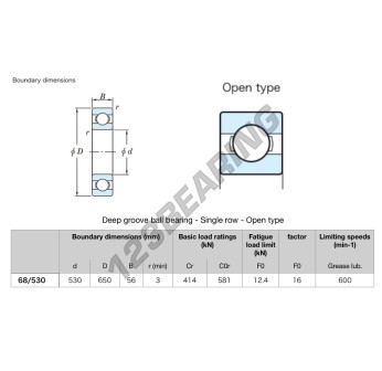 El Rodamiento De Bolas, conocido como 68-530-JTEKT JTEKT, tiene un diámetro interior de 530 mm, un diámetro exterior de 650 mm y un espesor de 56 mm.