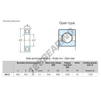El Rodamiento De Bolas, conocido como 6872-KOYO JTEKT, tiene un diámetro interior de 360 mm, un diámetro exterior de 440 mm y un espesor de 38 mm.