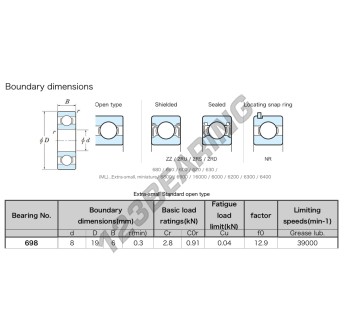 El Rodamiento De Bolas, conocido como 698-JTEKT JTEKT, tiene un diámetro interior de 8 mm, un diámetro exterior de 19 mm y un espesor de 6 mm.