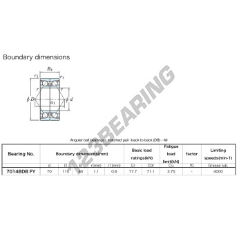 El Rodamiento De Bolas, conocido como 7014-BDB-FY-JTEKT JTEKT, tiene un diámetro interior de 70 mm, un diámetro exterior de 110 mm y un espesor de 40 mm.