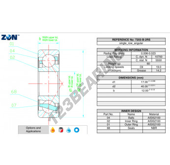 El Rodamiento De Bolas, conocido como 7203-B-2RS-ZEN ZEN, tiene un diámetro interior de 17 mm, un diámetro exterior de 40 mm y un espesor de 12 mm.