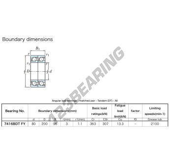 El Rodamiento De Bolas, conocido como 7416-BDT-FY-JTEKT JTEKT, tiene un diámetro interior de 80 mm, un diámetro exterior de 200 mm y un espesor de 96 mm.