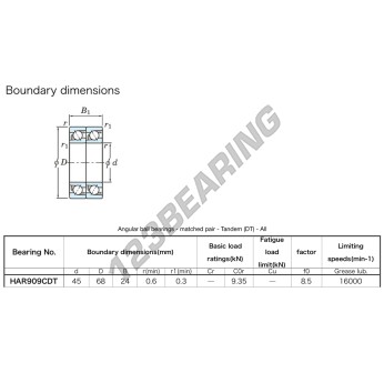 El Rodamiento De Bolas, conocido como HAR-909-CDT-JTEKT JTEKT, tiene un diámetro interior de 45 mm, un diámetro exterior de 68 mm y un espesor de 24 mm.