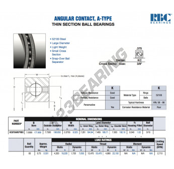 El Rodamiento De Bolas, conocido como KC070-AR0-RBC RBC, tiene un diámetro interior de 177.8 mm, un diámetro exterior de 196.85 mm y un espesor de 9.525 mm.