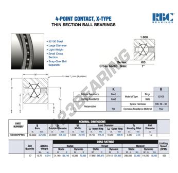 El Rodamiento De Bolas, conocido como KG180XP0-RBC RBC, tiene un diámetro interior de 457.2 mm, un diámetro exterior de 508 mm y un espesor de 25.4 mm.
