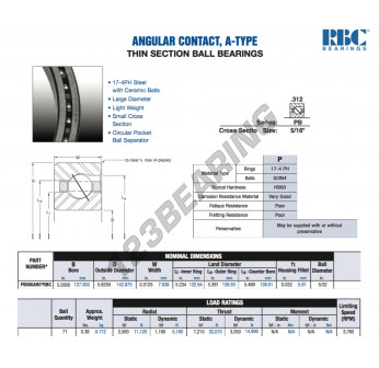El Rodamiento De Bolas, conocido como PB050-AR0-RBC RBC, tiene un diámetro interior de 127 mm, un diámetro exterior de 142.875 mm y un espesor de 7.938 mm.