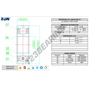 El Rodamiento De Bolas, conocido como S6006-2RS-C3-ZEN ZEN, tiene un diámetro interior de 30 mm, un diámetro exterior de 55 mm y un espesor de 13 mm.