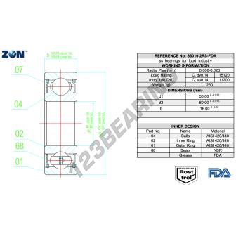 El Rodamiento De Bolas, conocido como S6010-2RS-FDA-AISI420-ZEN ZEN, tiene un diámetro interior de 50 mm, un diámetro exterior de 80 mm y un espesor de 16 mm.