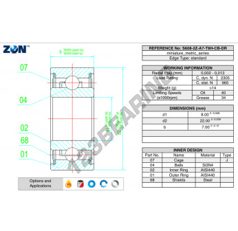 El Rodamiento De Bolas, conocido como S608-ZZ-A7-T9H-CB-DRY-ZEN ZEN, tiene un diámetro interior de 8 mm, un diámetro exterior de 22 mm y un espesor de 7 mm.