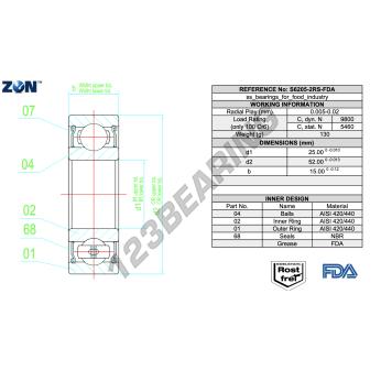 El Rodamiento De Bolas, conocido como S6205-2RS-FDA-AISI420-ZEN ZEN, tiene un diámetro interior de 25 mm, un diámetro exterior de 52 mm y un espesor de 15 mm.