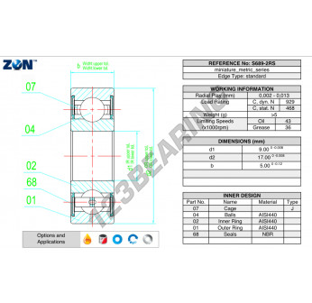 El Rodamiento De Bolas, conocido como S689-2RS-ZEN ZEN, tiene un diámetro interior de 9 mm, un diámetro exterior de 17 mm y un espesor de 5 mm.