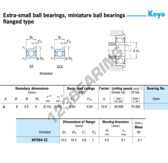 El Rodamiento De Bolas, conocido como WF684-ZZ-JTEKT JTEKT, tiene un diámetro interior de 4 mm, un diámetro exterior de 9 mm y un espesor de 2.5 mm.
