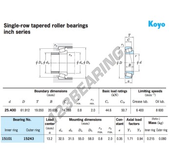 El Rodamiento Cónico, conocido como 15101-15243-JTEKT JTEKT, tiene un diámetro interior de 25.4 mm, un diámetro exterior de 61.912 mm y un espesor de 19.05 mm.