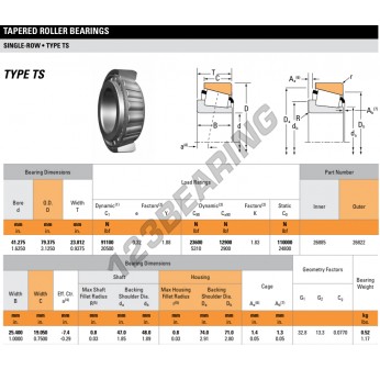 El Rodamiento Cónico, conocido como 26885-26822-TIMKEN TIMKEN, tiene un diámetro interior de 41.275 mm, un diámetro exterior de 79.375 mm y un espesor de 23.812 mm.