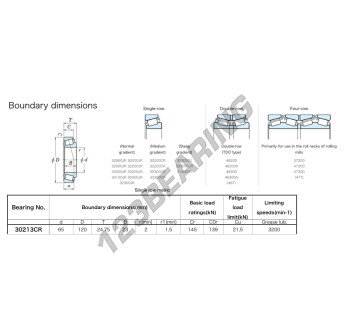 El Rodamiento Cónico, conocido como 30213-CR-JTEKT JTEKT, tiene un diámetro interior de 60 mm, un diámetro exterior de 120 mm y un espesor de 24.75 mm.