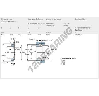 El Rodamiento Cónico, conocido como 31319-J2-SKF SKF, tiene un diámetro interior de 95 mm, un diámetro exterior de 200 mm y un espesor de 49.5 mm.