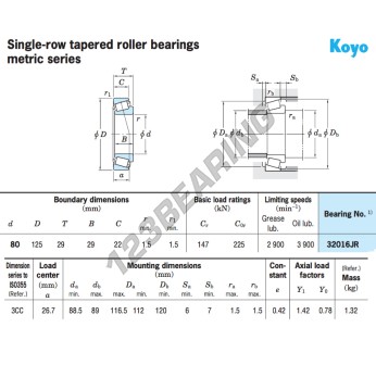 El Rodamiento Cónico, conocido como 32016-JR-JTEKT JTEKT, tiene un diámetro interior de 80 mm, un diámetro exterior de 125 mm y un espesor de 29 mm.