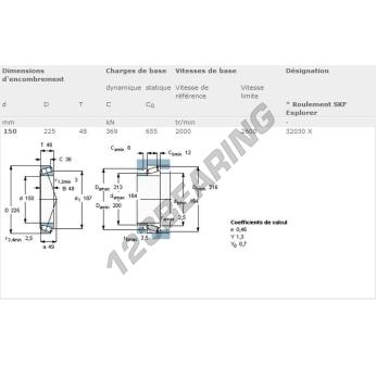 El Rodamiento Cónico, conocido como 32030-X-SKF SKF, tiene un diámetro interior de 150 mm, un diámetro exterior de 225 mm y un espesor de 48 mm.