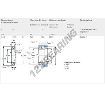 El Rodamiento Cónico, conocido como 32032X-SKF SKF, tiene un diámetro interior de 160 mm, un diámetro exterior de 240 mm y un espesor de 51 mm.