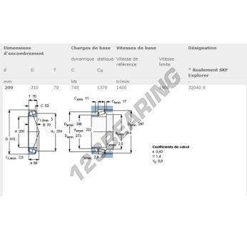 El Rodamiento Cónico, conocido como 32040X-SKF SKF, tiene un diámetro interior de 200 mm, un diámetro exterior de 310 mm y un espesor de 70 mm.