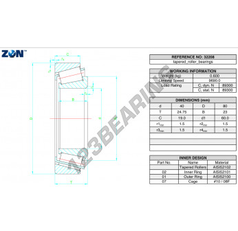 El Rodamiento Cónico, conocido como 32208-ZEN ZEN, tiene un diámetro interior de 40 mm, un diámetro exterior de 80 mm y un espesor de 24.75 mm.