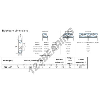 El Rodamiento Cónico, conocido como 32214-CR-JTEKT JTEKT, tiene un diámetro interior de 70 mm, un diámetro exterior de 125 mm y un espesor de 33.25 mm.