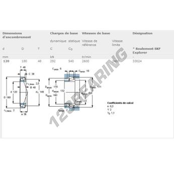 El Rodamiento Cónico, conocido como 33024-SKF SKF, tiene un diámetro interior de 120 mm, un diámetro exterior de 180 mm y un espesor de 48 mm.
