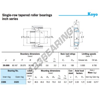 El Rodamiento Cónico, conocido como 3386-3320-JTEKT JTEKT, tiene un diámetro interior de 39.688 mm, un diámetro exterior de 80.167 mm y un espesor de 29.37 mm.