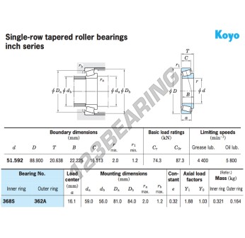 El Rodamiento Cónico, conocido como 368S-362A-JTEKT JTEKT, tiene un diámetro interior de 51.592 mm, un diámetro exterior de 88.9 mm y un espesor de 20.638 mm.