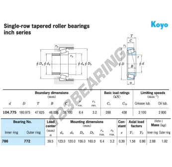 El Rodamiento Cónico, conocido como 786-772-JTEKT JTEKT, tiene un diámetro interior de 104.775 mm, un diámetro exterior de 180.975 mm y un espesor de 47.625 mm.
