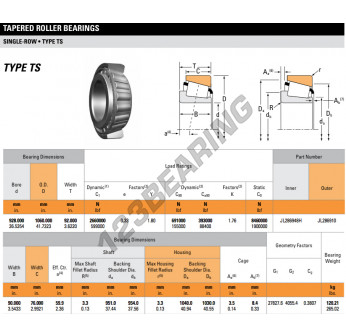 El Rodamiento Cónico, conocido como JL286948H-JL286910-TIMKEN TIMKEN, tiene un diámetro interior de 928 mm, un diámetro exterior de 1060 mm y un espesor de 92 mm.