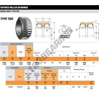 El Rodamiento Cónico, conocido como L319249-L319210D-TIMKEN TIMKEN, tiene un diámetro interior de 95.25 mm, un diámetro exterior de 130.175 mm y un espesor de 47.622 mm.