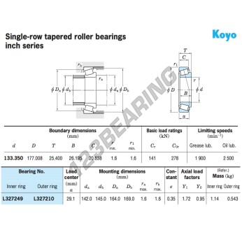 El Rodamiento Cónico, conocido como L327249-L327210-JTEKT JTEKT, tiene un diámetro interior de mm, un diámetro exterior de mm y un espesor de mm.