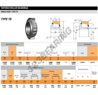 El Rodamiento Cónico, conocido como L860049-L860010-TIMKEN TIMKEN, tiene un diámetro interior de 330.2 mm, un diámetro exterior de 415.925 mm y un espesor de 47.625 mm.