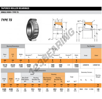 El Rodamiento Cónico, conocido como LM236749-LM236710A-TIMKEN TIMKEN, tiene un diámetro interior de 184.15 mm, un diámetro exterior de 235.229 mm y un espesor de 34 mm.