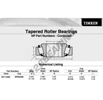 El Rodamiento Cónico, conocido como NP114036-NP064306-TIMKEN TIMKEN, tiene un diámetro interior de 57.15 mm, un diámetro exterior de 96.973 mm y un espesor de 21.946 mm.