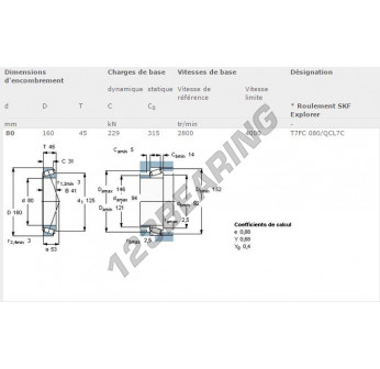El Rodamiento Cónico, conocido como T7FC080-QCL7C-SKF SKF, tiene un diámetro interior de 80 mm, un diámetro exterior de 160 mm y un espesor de 45 mm.