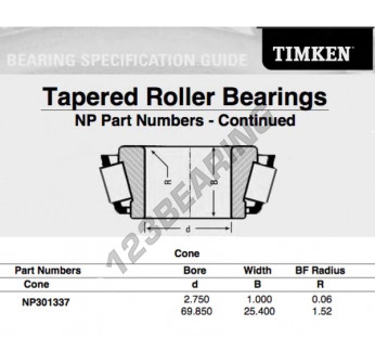 El Cono, conocido como NP301337-TIMKEN TIMKEN, tiene un diámetro interior de 69.85 mm.