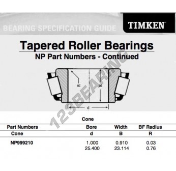 El Cono, conocido como NP999210-TIMKEN TIMKEN, tiene un diámetro interior de 25.4 mm.