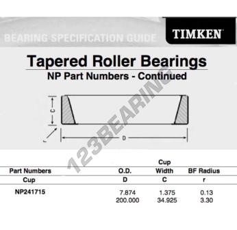 La Cubeta, conocida como NP241715-TIMKEN TIMKEN, tiene un diámetro interior de mm, un diámetro exterior de 200 mm y un espesor de 34.925 mm.