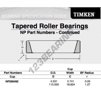 La Cubeta, conocida como NP266492-TIMKEN TIMKEN, tiene un diámetro interior de mm, un diámetro exterior de 110 mm y un espesor de 18.824 mm.