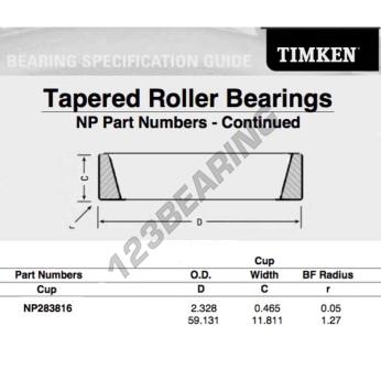 La Cubeta, conocida como NP283816-TIMKEN TIMKEN, tiene un diámetro interior de mm, un diámetro exterior de 59.131 mm y un espesor de 11.811 mm.