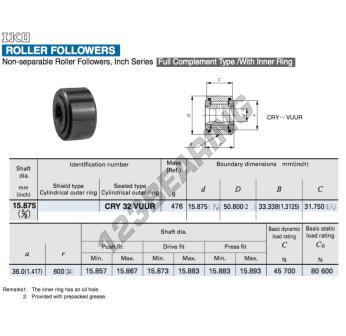 La Leva De Rodamiento, conocida como CRY32-VUUR-IKO IKO, tiene un diámetro interior de 15.875 mm, un diámetro exterior de 50.8 mm y un espesor de 33.338 mm.