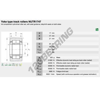La Leva De Rodamiento, conocida como NUTR1747-A-INA INA, tiene un diámetro interior de 17 mm, un diámetro exterior de 47 mm y un espesor de 21 mm.