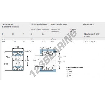 El Rodamiento Rodillos, conocido como 31312-J2-QDF-SKF SKF, tiene un diámetro interior de 60 mm, un diámetro exterior de 130 mm y un espesor de 67 mm.