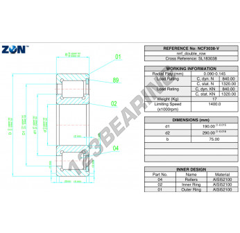 El Rodamiento Rodillos, conocido como NCF3038-V-ZEN ZEN, tiene un diámetro interior de 190 mm, un diámetro exterior de 290 mm y un espesor de 75 mm.