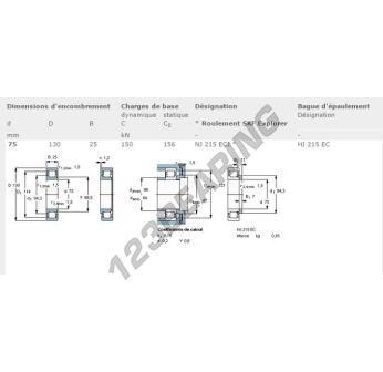 El Rodamiento Rodillos, conocido como NJ215-ECJ-SKF SKF, tiene un diámetro interior de 75 mm, un diámetro exterior de 130 mm y un espesor de 25 mm.