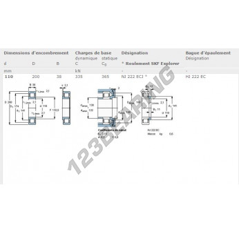 El Rodamiento Rodillos, conocido como NJ222-ECJ-SKF SKF, tiene un diámetro interior de 110 mm, un diámetro exterior de 200 mm y un espesor de 38 mm.